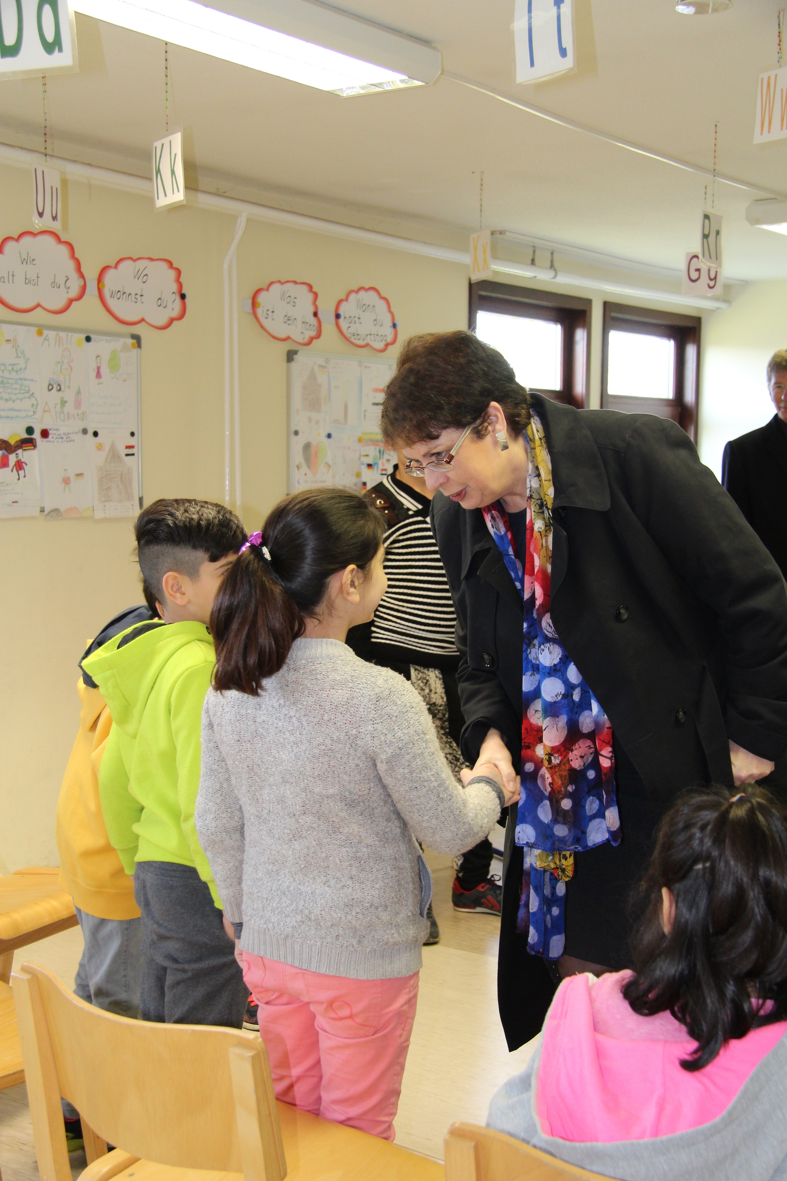Auf dem Rundgang über das Gelände verschaffte sich die Staatssekretärin einen Eindruck davon, wie nah die Friedländer Bevölkerung und die Asylbegehrenden zusammen wohnen und wie gut sich die Erstaufnahmeeinrichtung des Landes Niedersachsen in das Dorf einfügt. Vor allem die pädagogischen Angebote vor Ort überzeugten die Besucher. Irina Schröder und Swetlana Starikowa gaben einen Einblick in die ‚Interkulturelle Lernwerkstatt‘, die als Vorbereitungsunterricht für die Regelschule dient. Hier lernen die Kinder im schulpflichtigen Alter spielerisch die deutsche Sprache. Staatssekretärin Honé konnte so schon kurze Unterhaltungen zu den Fragen „Wie heißt du?“, „Wie alt bist du?“ oder „Woher kommst du?“ mit den Schulkindern führen. Ebenfalls nachhaltigen Eindruck hinterließ das pädagogische Konzept von Kaid Schullan. Der Lehrer unterrichtet Sprache und Kultur für Erwachsene in den sogenannten ‚Wegweiserkursen‘. Die didaktische Vermittlung der Sprache erfolgt vor allem über praktische Beispiele und mithilfe von Bewegung.