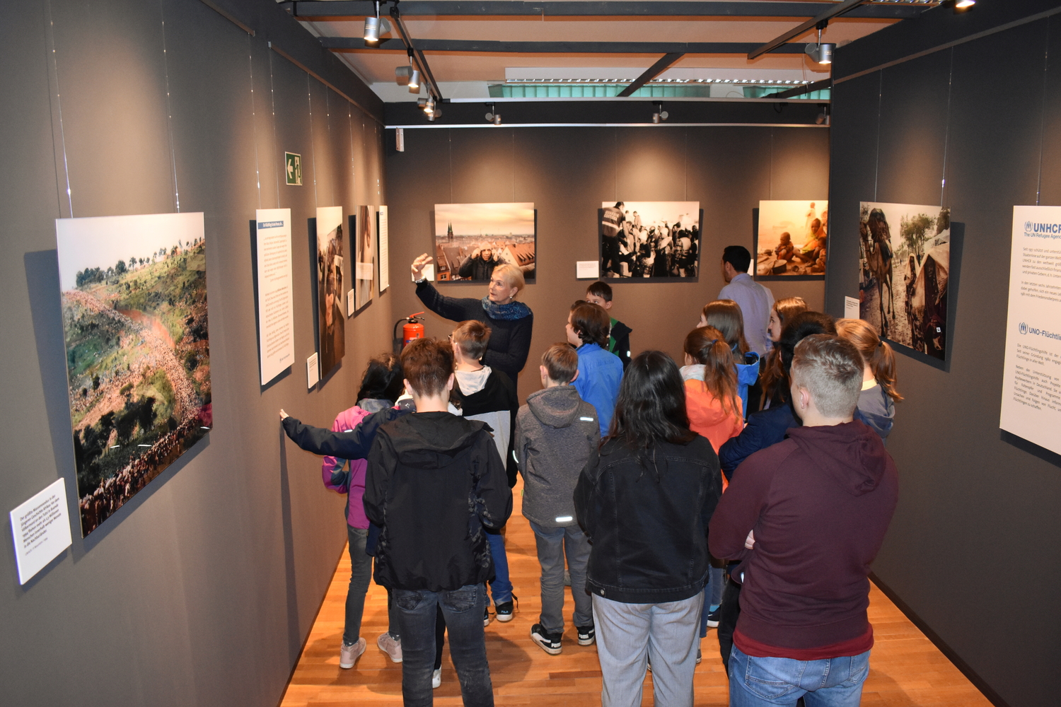 Nach einer Führung durch die derzeitige Foto-Ausstellung der UNO-Flüchtlingshilfe "Auf der Flucht" lernt die junge Gruppe im Bundesamt für Migration und Flüchtlinge, welche Faktoren in einem laufenden Asylverfahren entscheidend und wichtig sind. Dazu gehört auch die Abgabe der Fingerabdrücke mit echter FBI-Farbe[1]