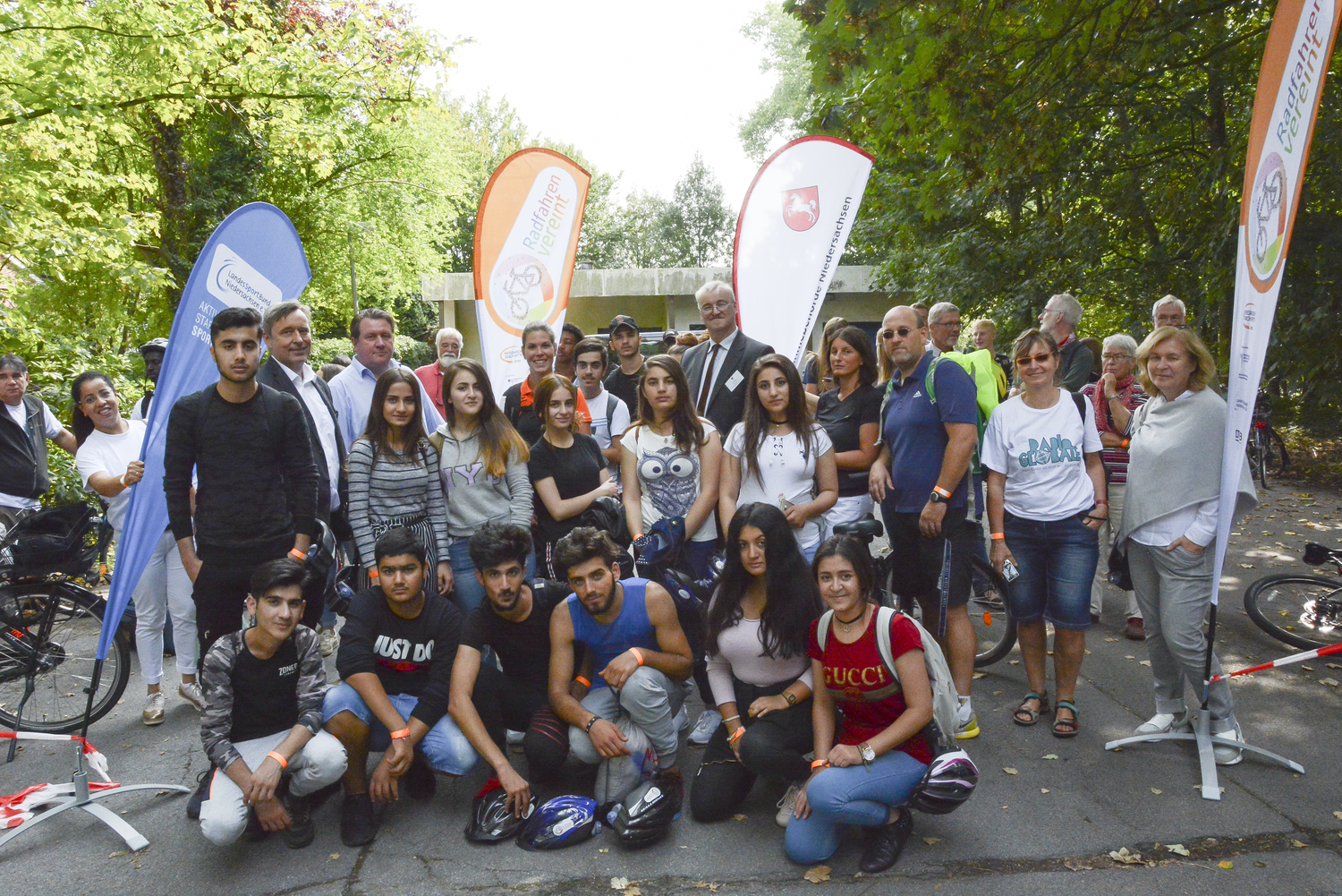 Rund 70 Radfahrerinnen und Radfahrer sind am Mittwoch, 29. August 2018, unter dem Motto „Radfahren vereint und Sport verbindet Menschen“ durch Oldenburg gefahren. Bei bestem Wetter radelte die gut gelaunte Gruppe vom Oldenburger Schlossplatz zum jährlichen Sommerfest der Erstaufnahmeeinrichtung der Landesaufnahmebehörde (LAB) Niedersachsen.
