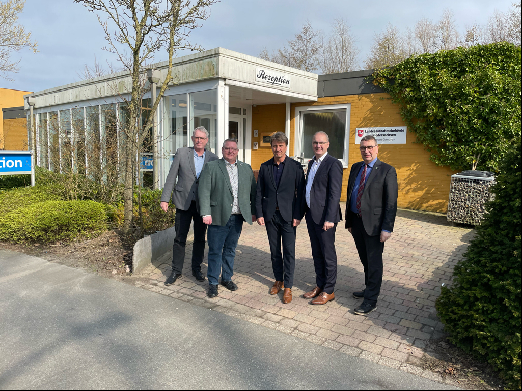 Die Notunterkunft für Geflüchtete der Landesaufnahmebehörde Niedersachsen in der Gemeinde Wangerland ist seit nunmehr fast einem Jahr in Betrieb. Staatssekretär Stephan Manke hat sich vor Ort mit dem Präsidenten der Landesaufnahmebehörde, Klaus Dierker, dem Landrat des Landkreises Friesland, Sven Ambrosy, sowie dem Bürgermeister der Gemeinde Wangerland, Mario Szlezak, getroffen und eine Zwischenbilanz gezogen.