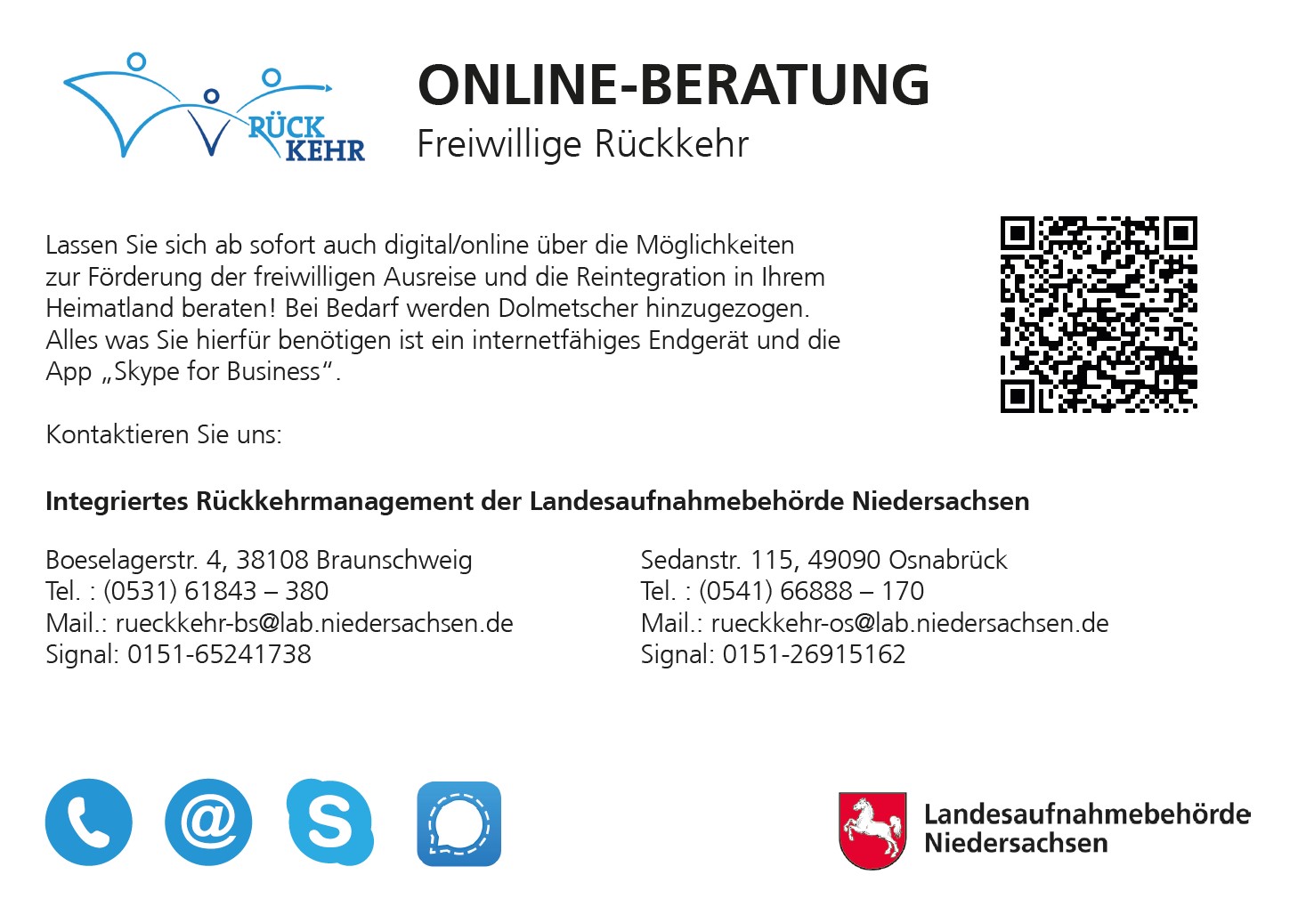 Landesaufnahmebehörde Niedersachsen Standort Braunschweig Boeselagerstraße 4 38108 Braunschweig Tel.: 0531 61843 - 380 rueckkehr-bs@lab.niedersachsen.de Öffnungszeiten: Mo. - Do. 9-15 Uhr Fr. 9-12 Uhr und nach Vereinbarung |
